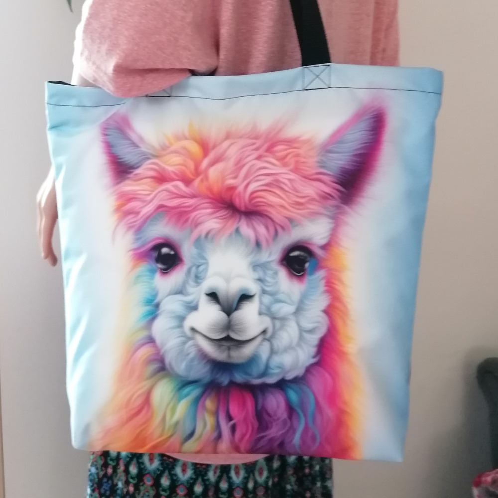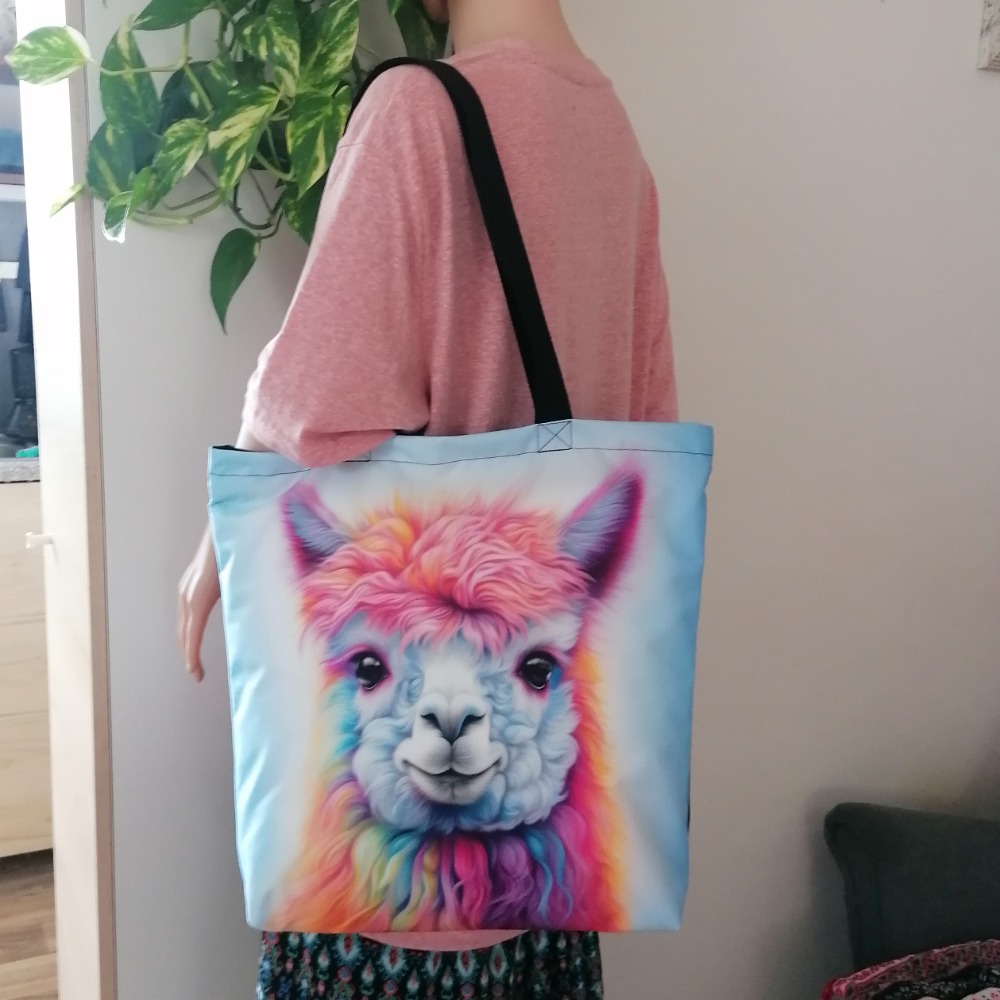 Rozměr tašky: šířka 40 x 36 cm + dno 10 cm. Délka popruhů je cca 60 cm vhodná na rameno, případně do ruky dle výšky postavy. Taška byla při focení vycpána polštářem 40 x 40 cm. Přední strana se zvoleným motivem/obrázkem, zadní strana černá.