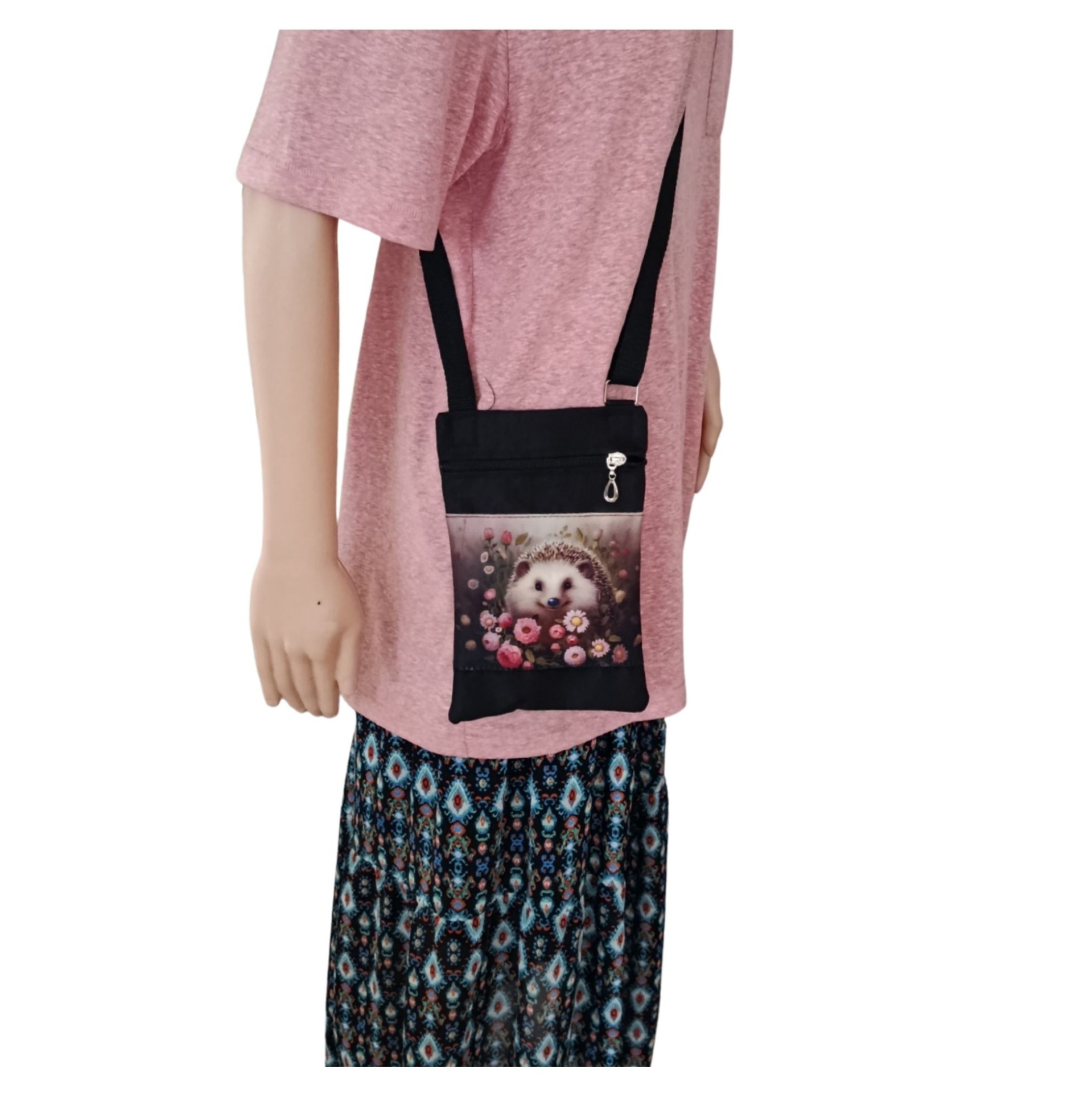 Kabelečka má nastavitelný popruh, takže ji pohodlně nosí dítě i dospělá osoba. Uzavírá se zipem a uvnitř je další kapsička na zip – ideální na karty, drobné peníze nebo klíče.