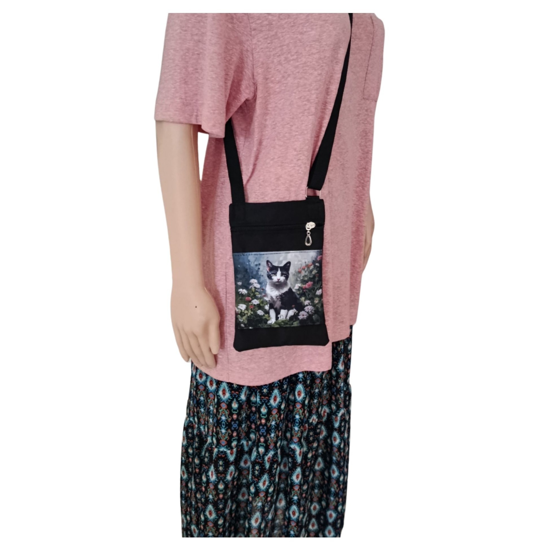 Kabelečka má nastavitelný popruh, takže ji pohodlně nosí dítě i dospělá osoba. Uzavírá se zipem a uvnitř je další kapsička na zip – ideální na karty, drobné peníze nebo klíče.