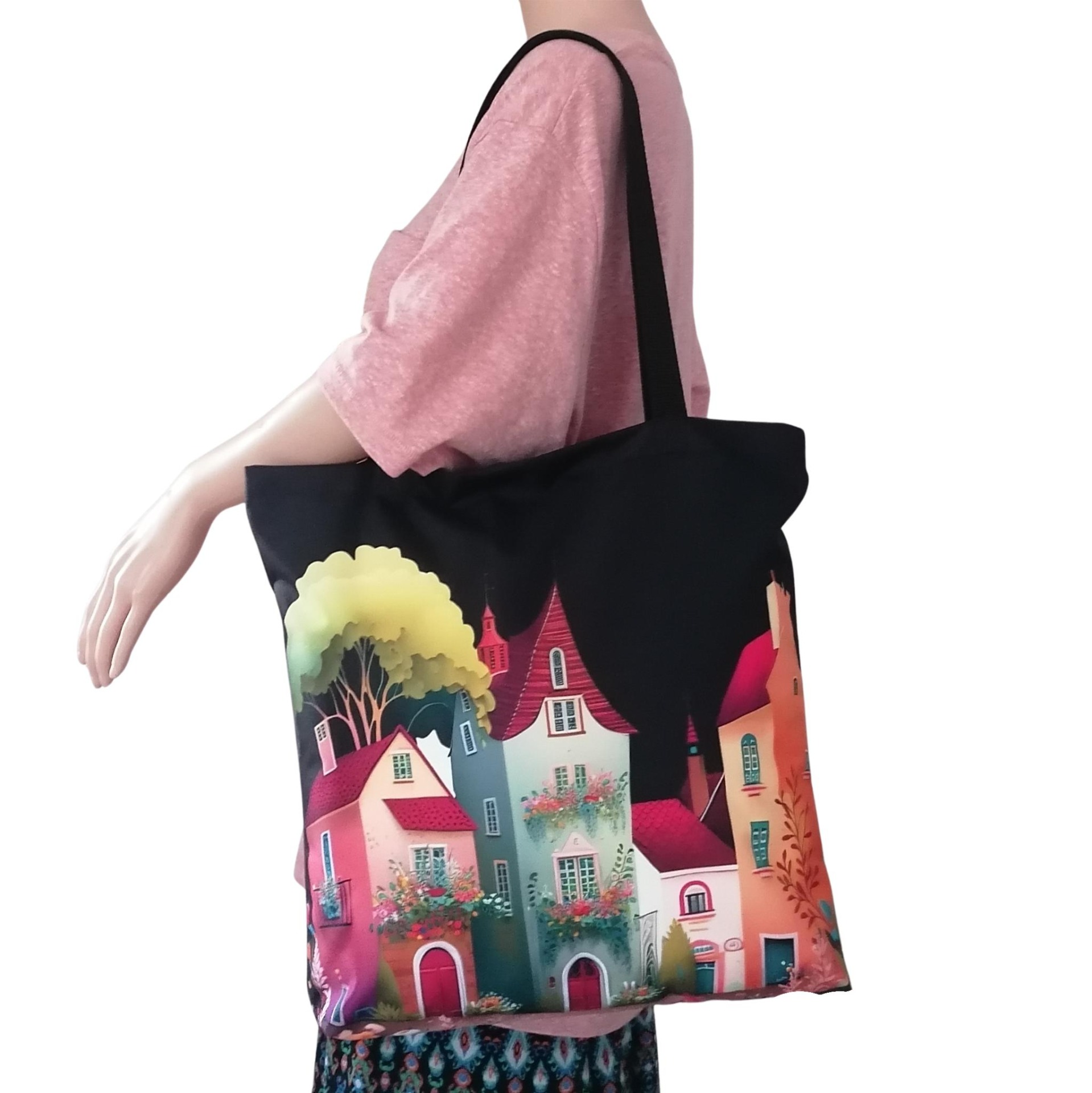Prostorná látková nákupní taška s motivem domů s květinami, kterou využiješ na nákup, na cesty i jako lehkou tašku na každý den.