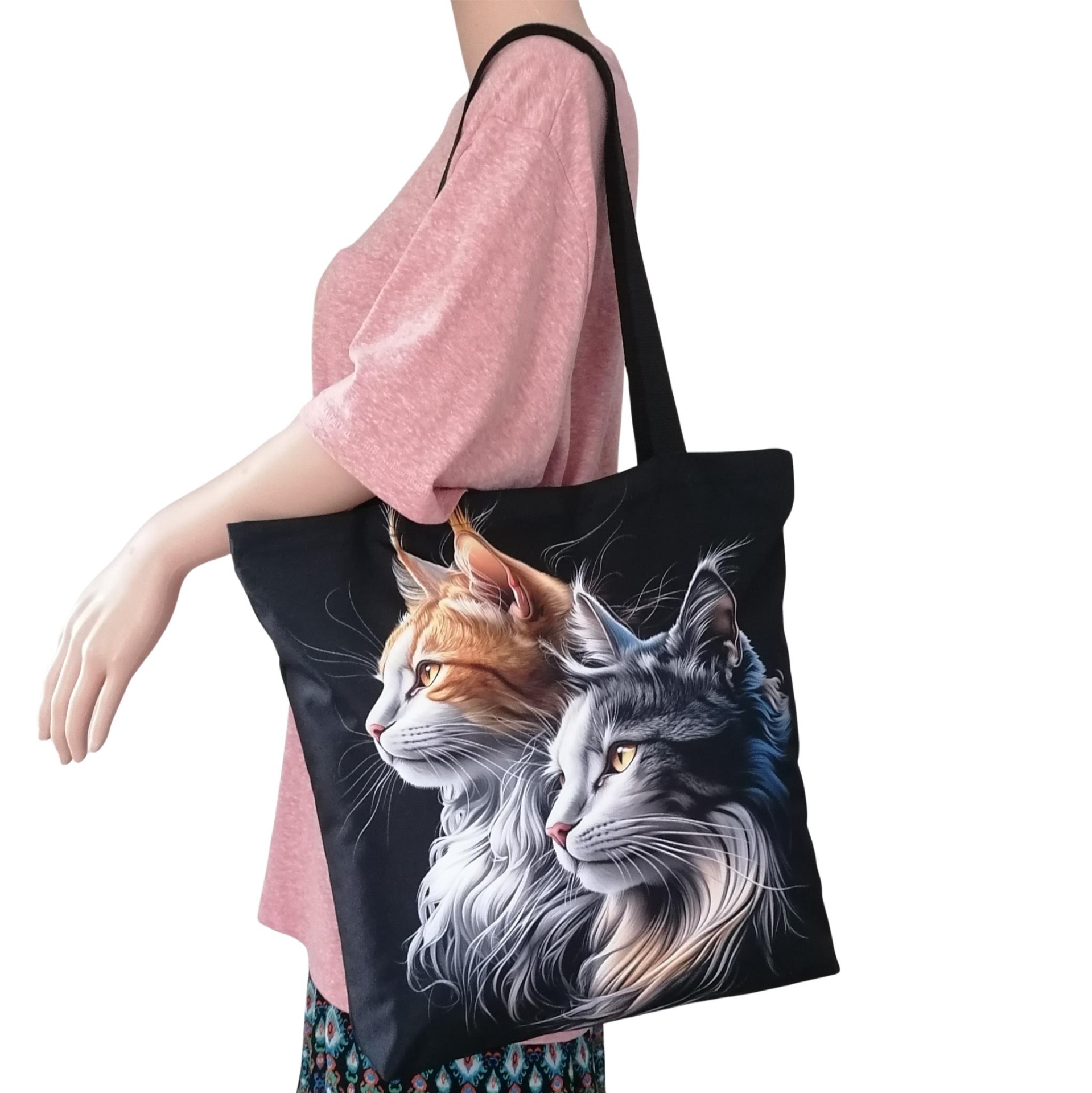 Prostorná látková nákupní taška s motivem koček mainských mývalích, kterou využiješ na nákup, na cesty i jako lehkou tašku na každý den.
