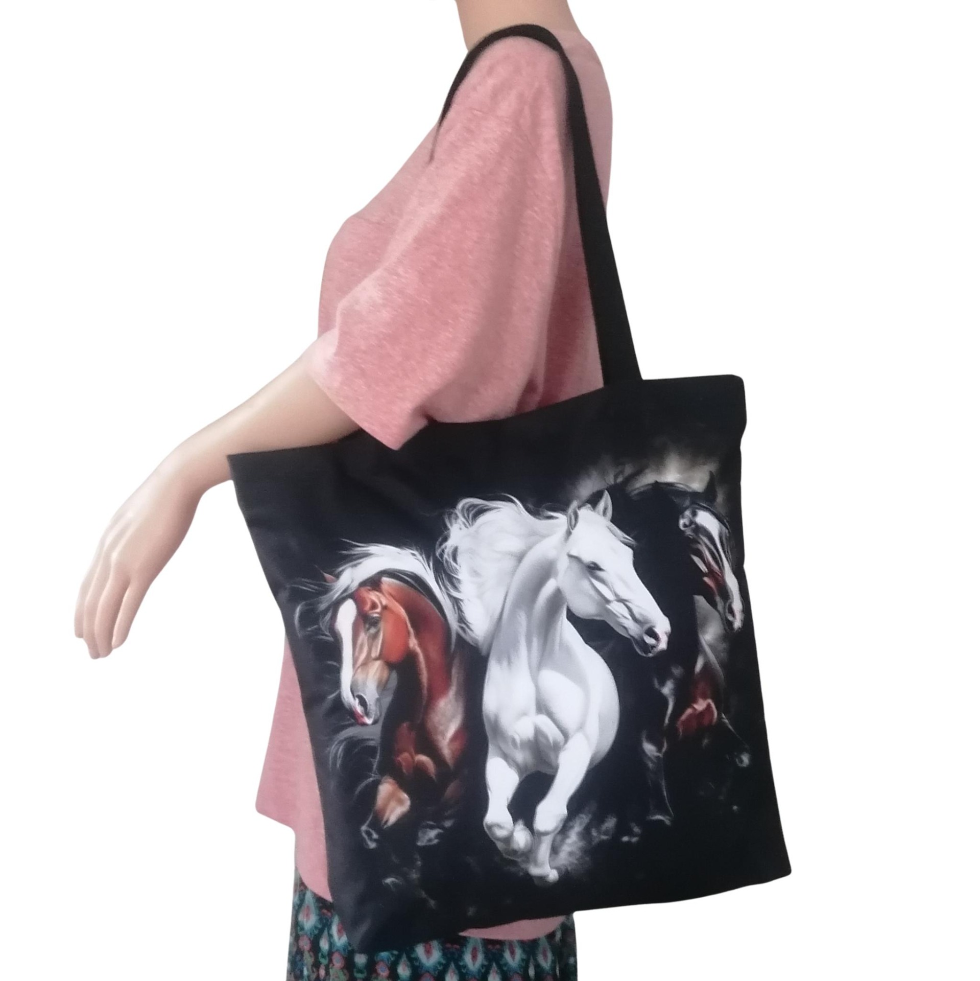Prostorná látková nákupní taška s motivem koní běžících plnou silou, kterou využiješ na nákup, na cesty i jako lehkou tašku na každý den.