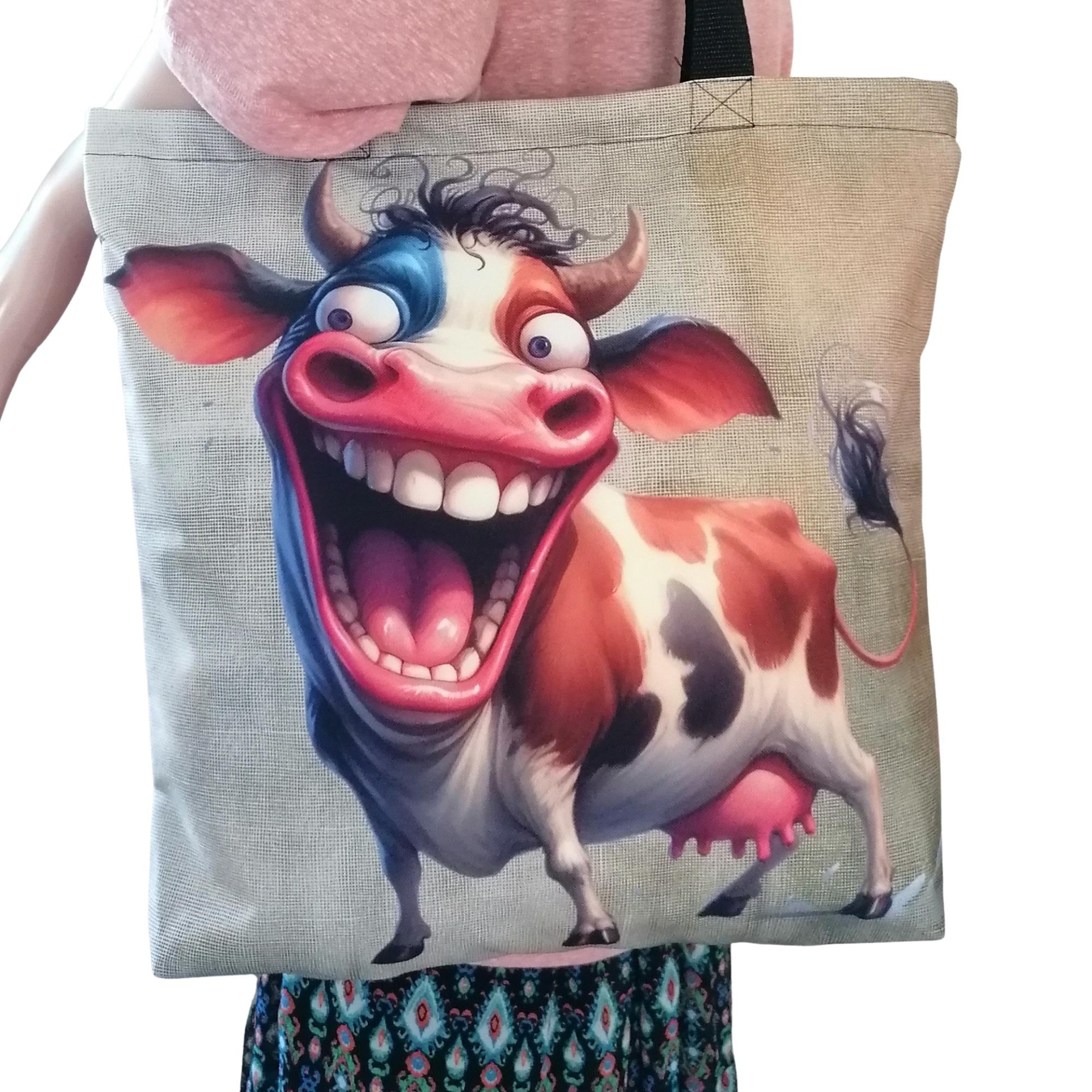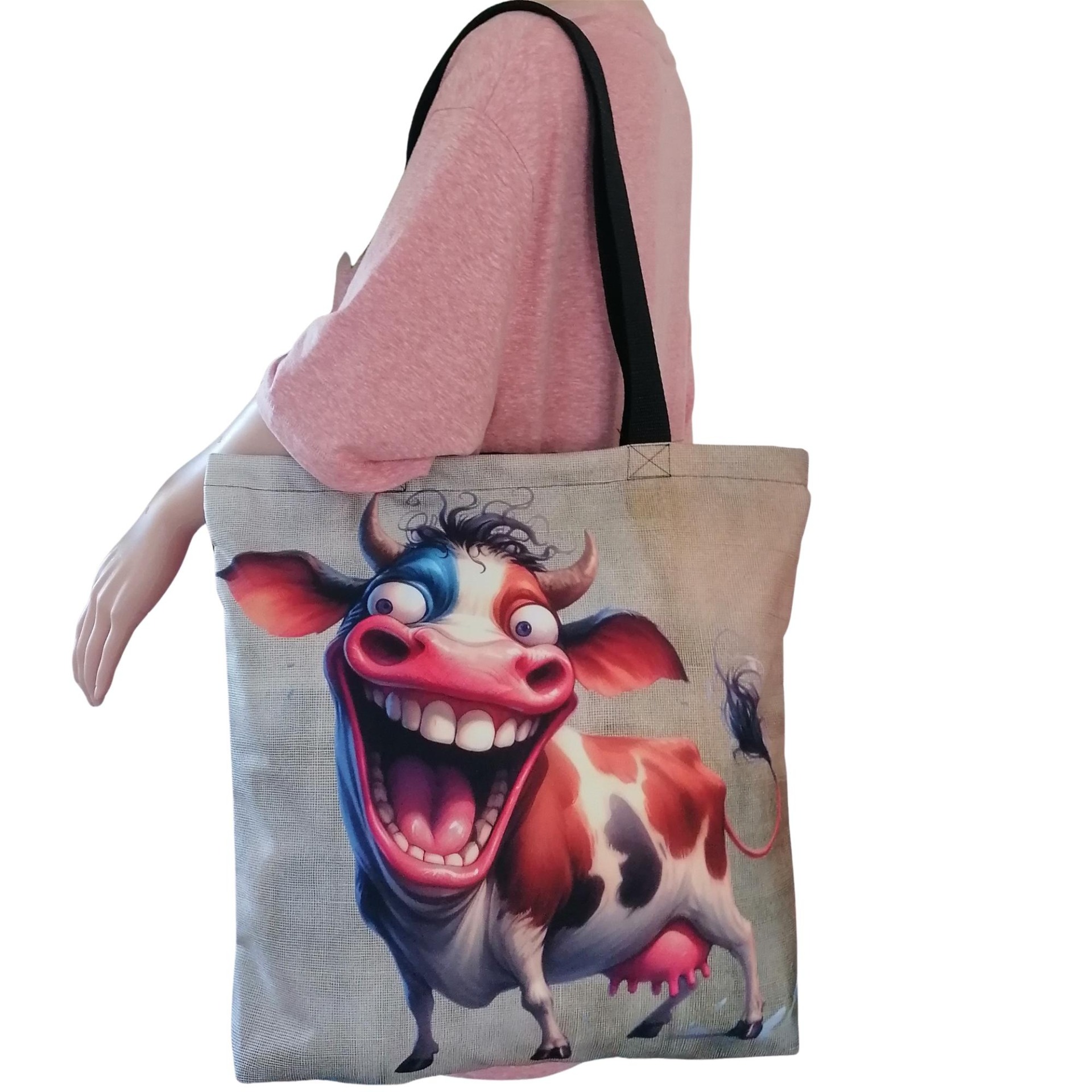 Prostorná látková nákupní taška s motivem radující se krávy, kterou využiješ na nákup, na cesty i jako lehkou tašku na každý den.