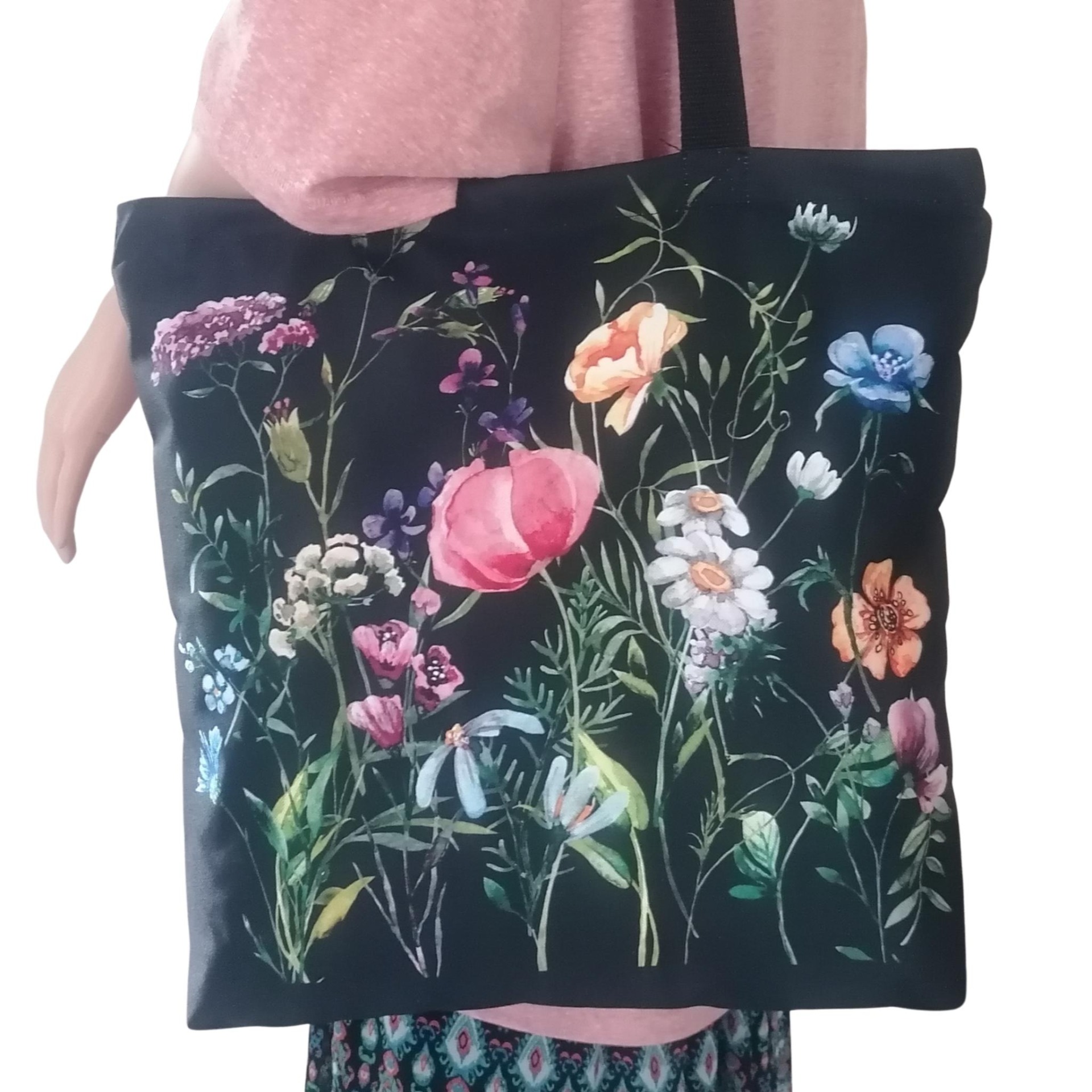 Prostorná látková nákupní taška s motivem dokonalosti lučního kvítí za hluboké noci, kterou využiješ na nákup, na cesty i jako lehkou tašku na každý den.