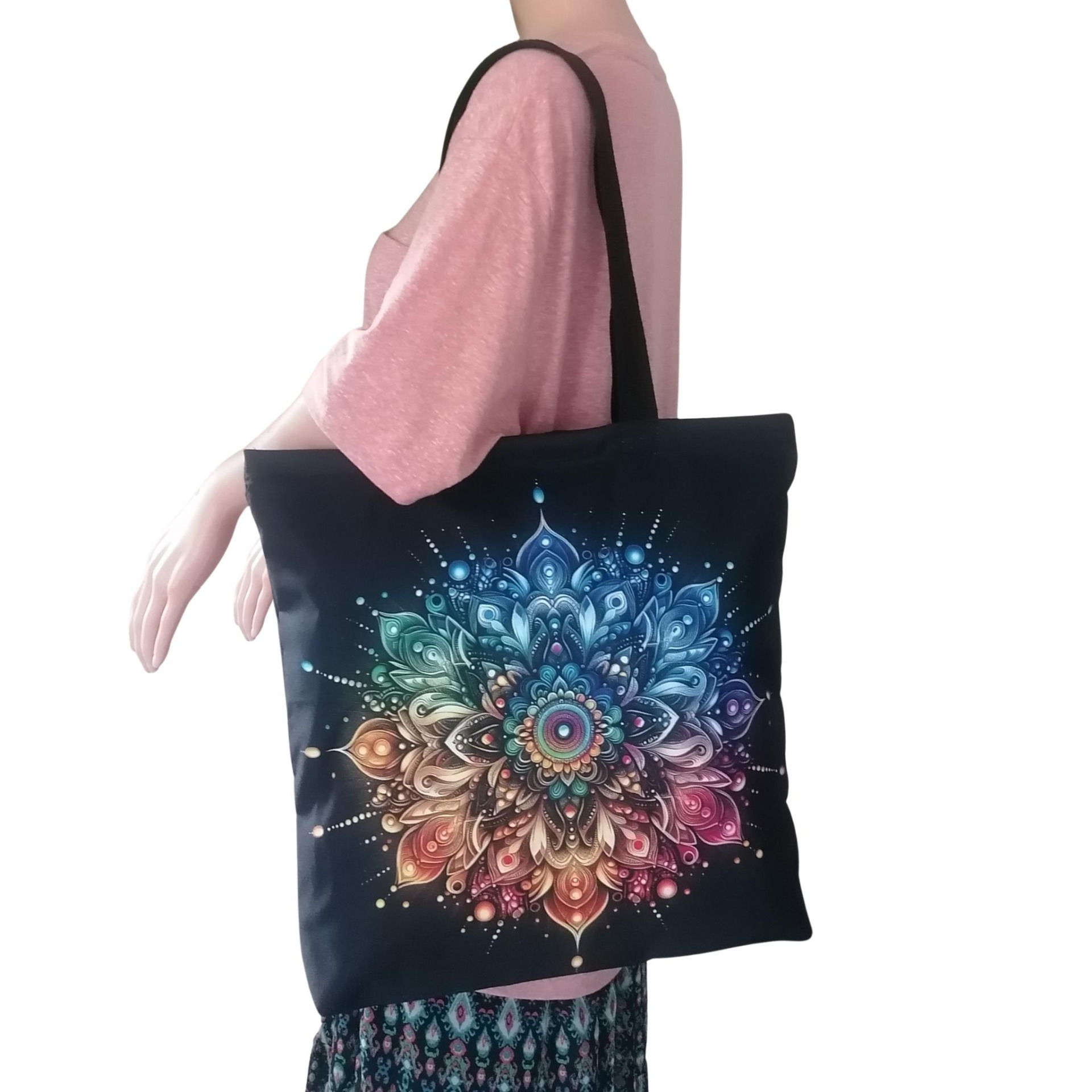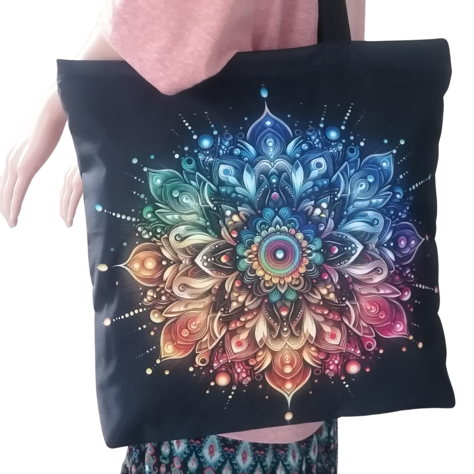 Prostorná látková nákupní taška s motivem mandaly klidu a rovnováhy, kterou využiješ na nákup, na cesty i jako lehkou tašku na každý den.