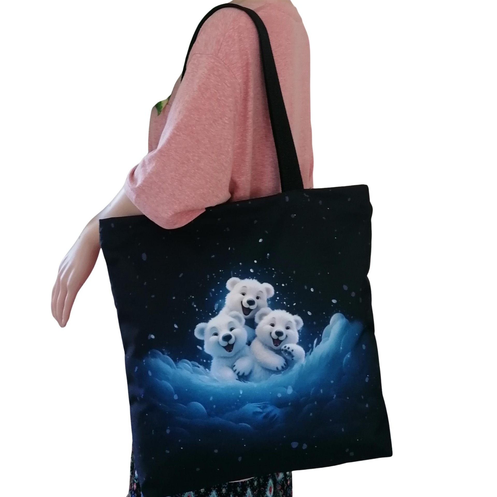 Prostorná látková nákupní taška s motivem třech ledních medvídků, kterou využiješ na nákup, na cesty i jako lehkou tašku na každý den.