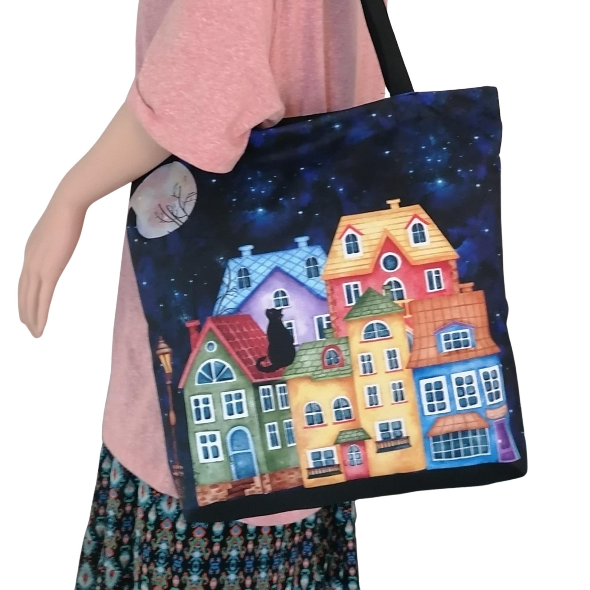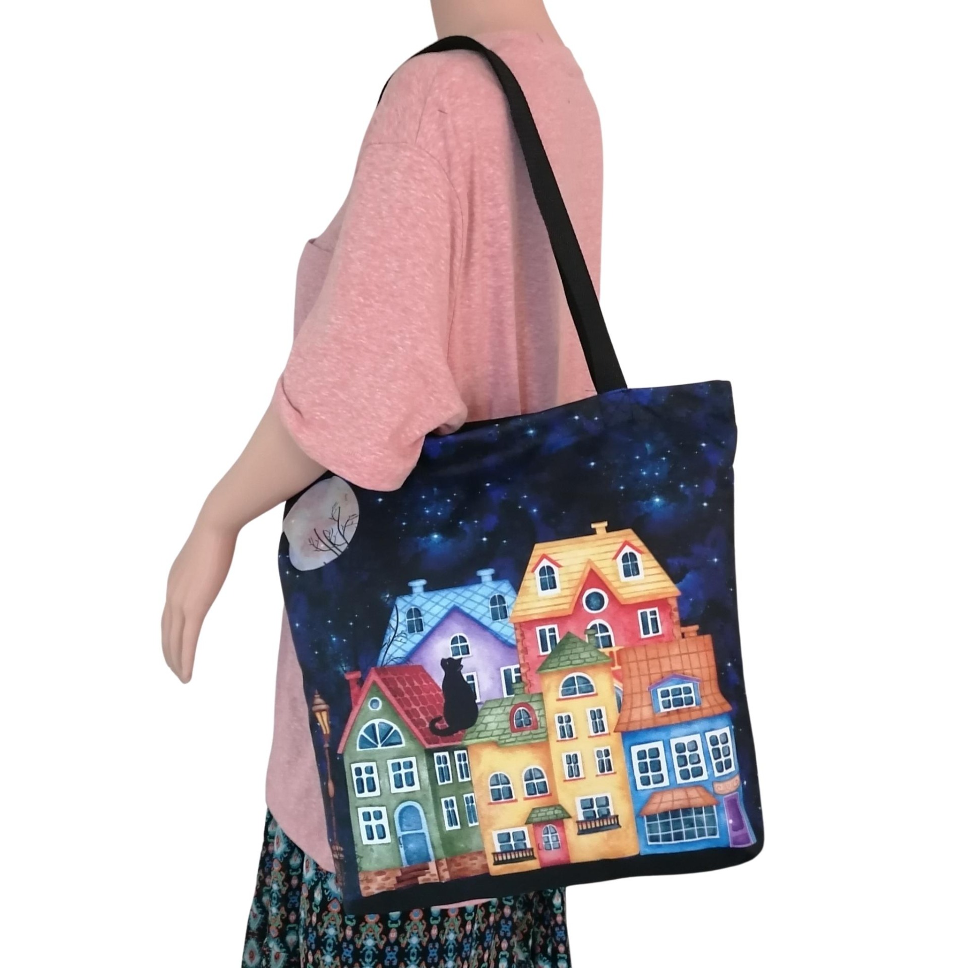 Prostorná látková nákupní taška s motivem nočního města při úplňku s kočičkou na střeše domu, kterou využiješ na nákup, na cesty i jako lehkou tašku na každý den.