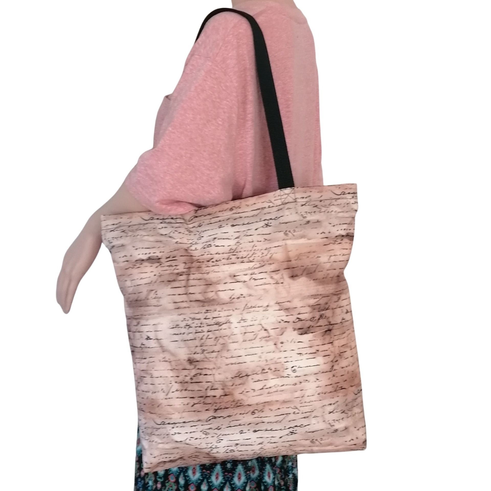 Prostorná látková nákupní taška s motivem rukopisu v nostalgickém tónu, kterou využiješ na nákup, na cesty i jako lehkou tašku na každý den.