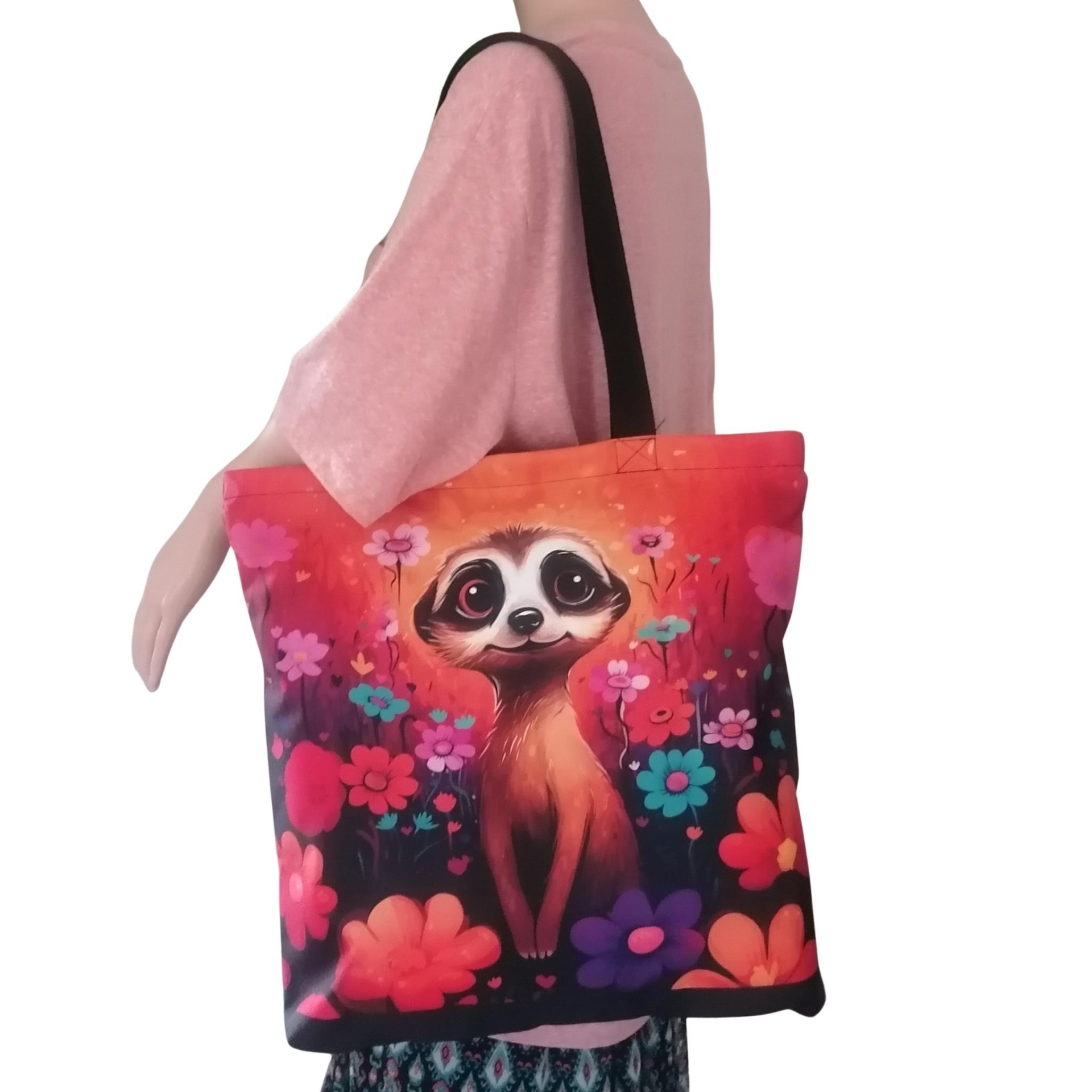 Prostorná látková nákupní taška s motivem surikaty v květinové zahradě, kterou využiješ na nákup, na cesty i jako lehkou tašku na každý den.