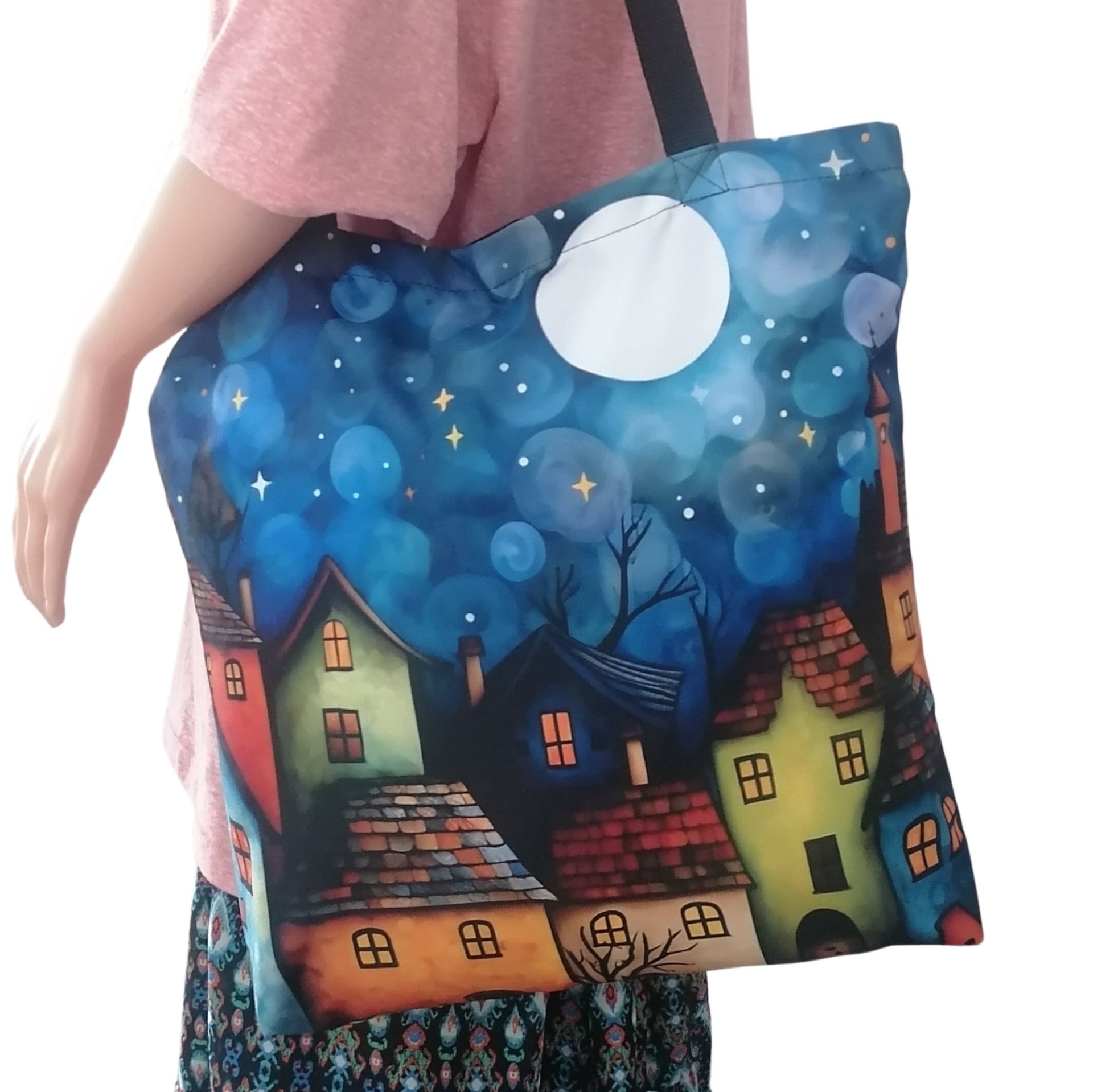 Prostorná látková nákupní taška s motivem domů, kterou využiješ na nákup, na cesty i jako lehkou tašku na každý den.