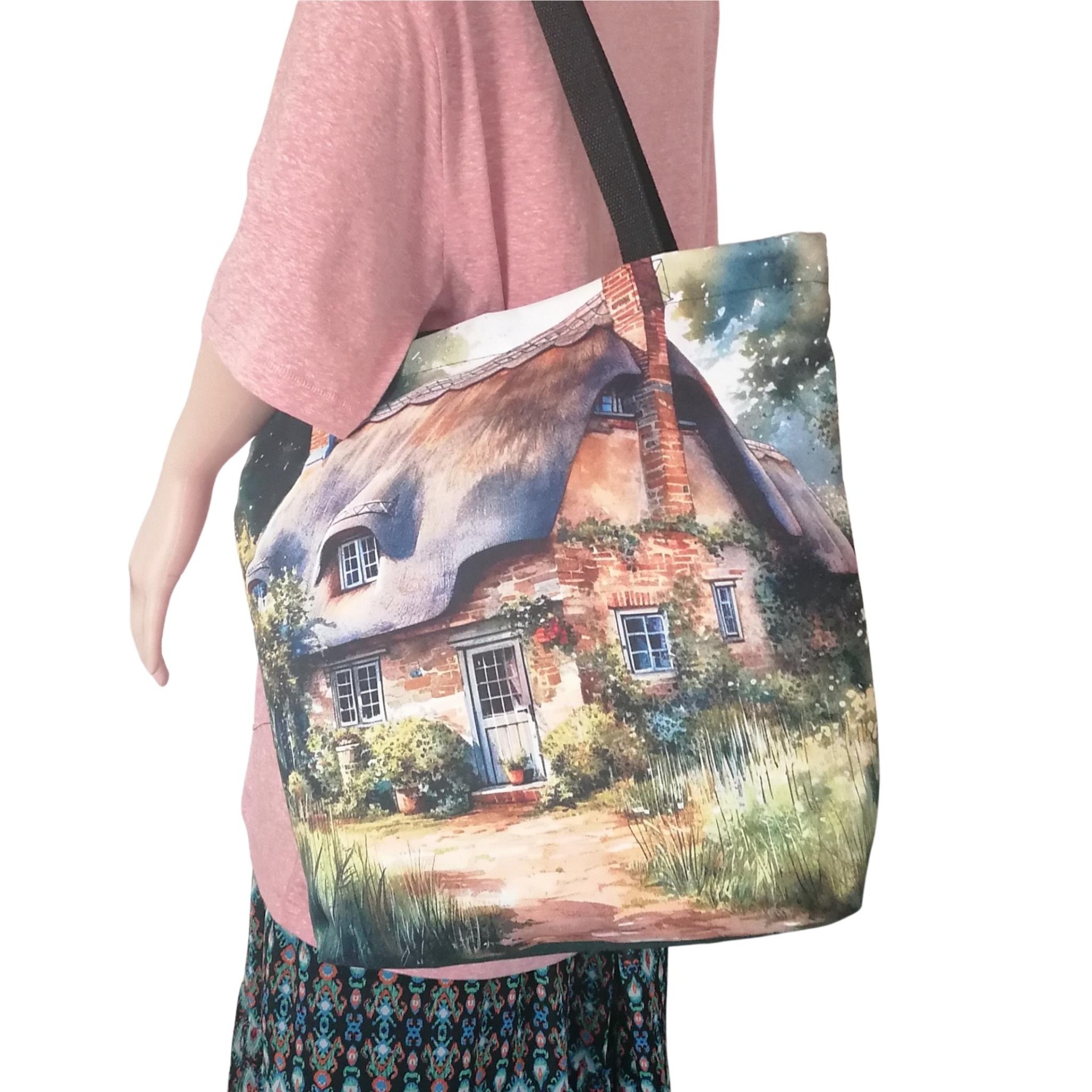 Prostorná látková nákupní taška s motivem vysněného domky na anglickém venkově, kterou využiješ na nákup, na cesty i jako lehkou tašku na každý den.