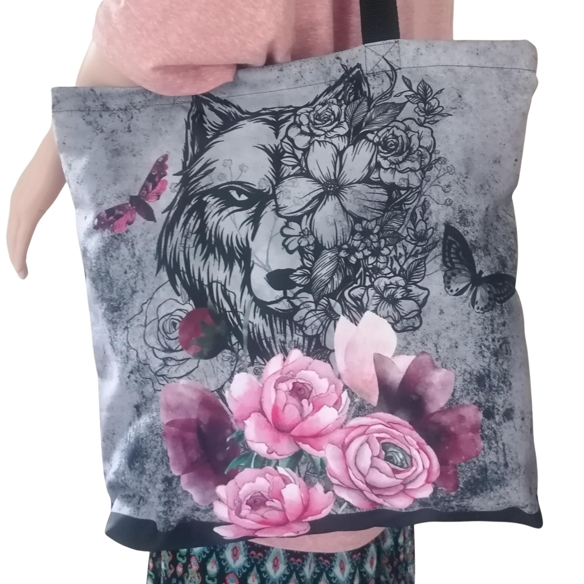 Prostorná látková nákupní taška s motivem vlka tatoo s vyjádřením vlastní identity, kterou využiješ na nákup, na cesty i jako lehkou tašku na každý den.