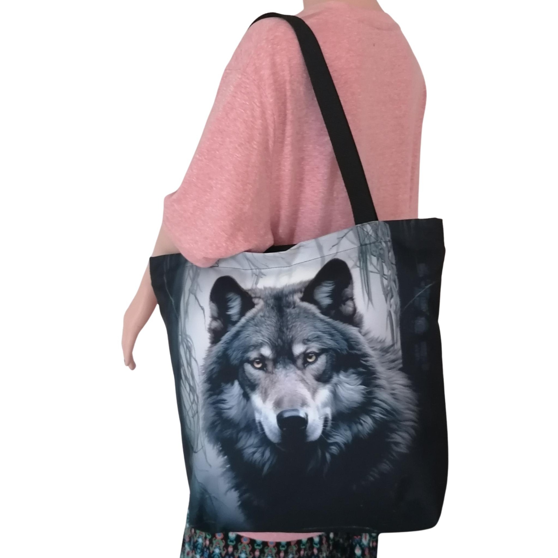 Prostorná látková nákupní taška s motivem vlka v nočním lese, kterou využiješ na nákup, na cesty i jako lehkou tašku na každý den.