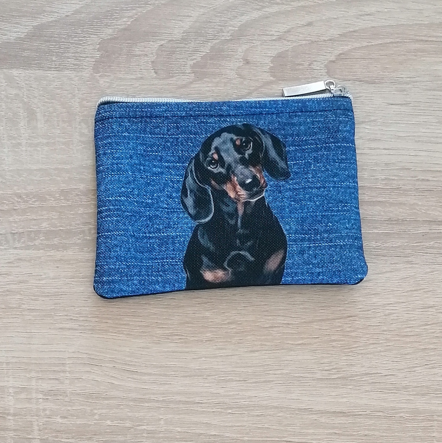 Pouzdro, taška, batoh. Černý jezevčík, denim pozadí.
