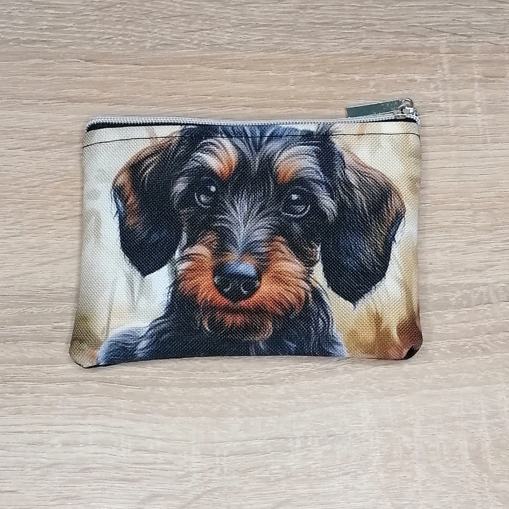 Pouzdro, taška, batoh. Sladký drsnosrstý jezevčík.