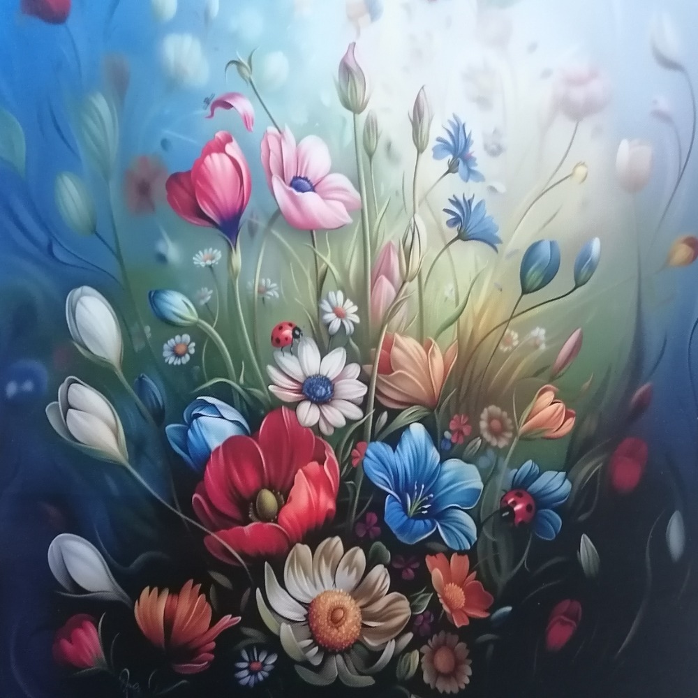 Povlak na polštář s autorským motivem rozkvetlých lučním kvítím.
