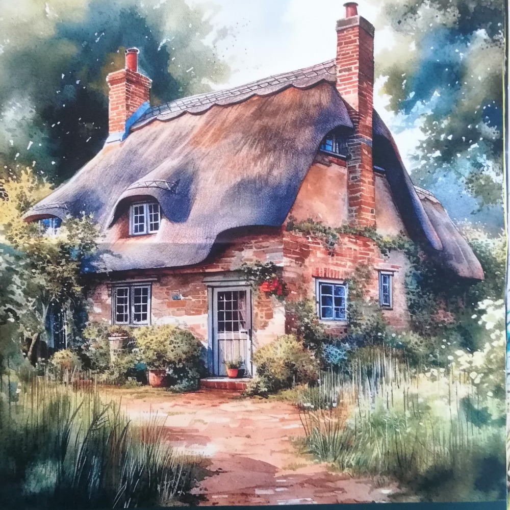 Povlak na polštář s autorským motivem anglického venkovského stavení.